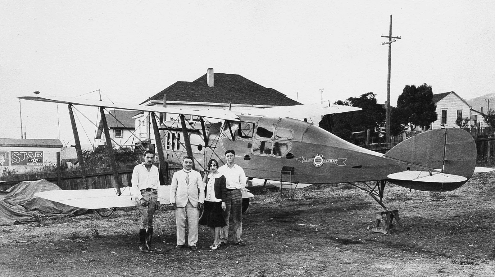 Pierre Allinio created a long string of aircraft innovations in the basement and rear yard of his home at 609 Kearney St. From left, Peter Allinio, Pierre Allinio, Marguerite Allinio and Frank Riley are seen in this photo looking northeast. In October 1930 Jimmy Angel and Pierre flew this five-place plane to Burbank, California, where they entered it in an endurance flight. EC Hist. Society Collection, photo courtesy of the Allinio family.