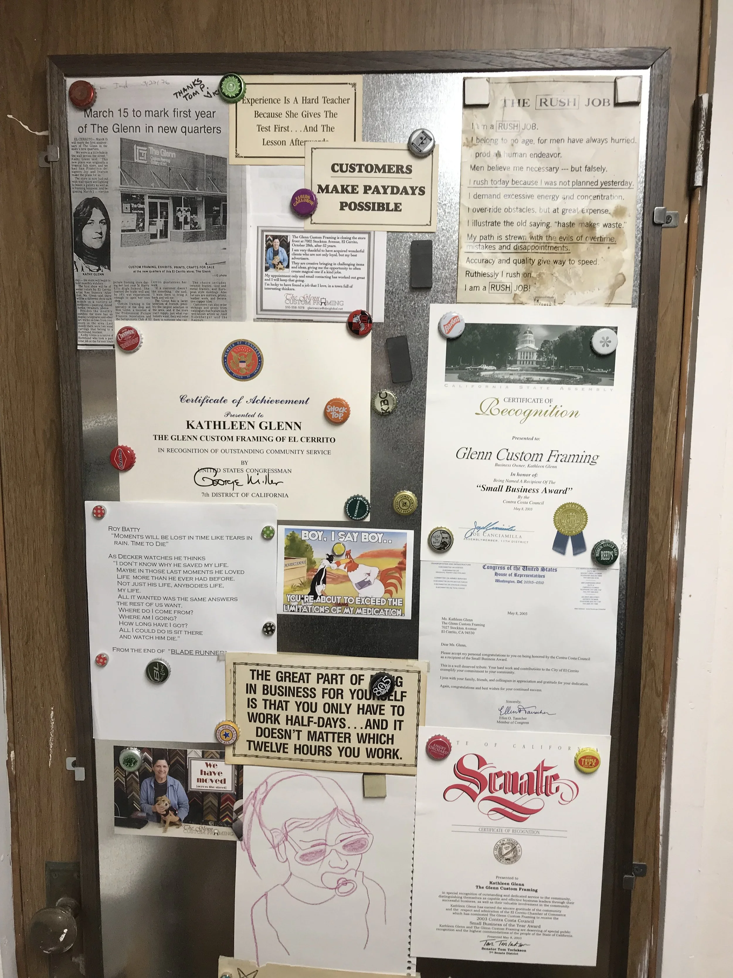 But the parking situation at the top of Fairmount had gotten “horrendous” by then, she said, and in 1988 she moved her business to 7027 Stockton Ave., across from the 7-11 store. To better accommodate clients who were bringing in items of various shapes and sizes and picking them up fully framed, Glenn got permission from the city to create a 15-minute parking space in front of her shop.