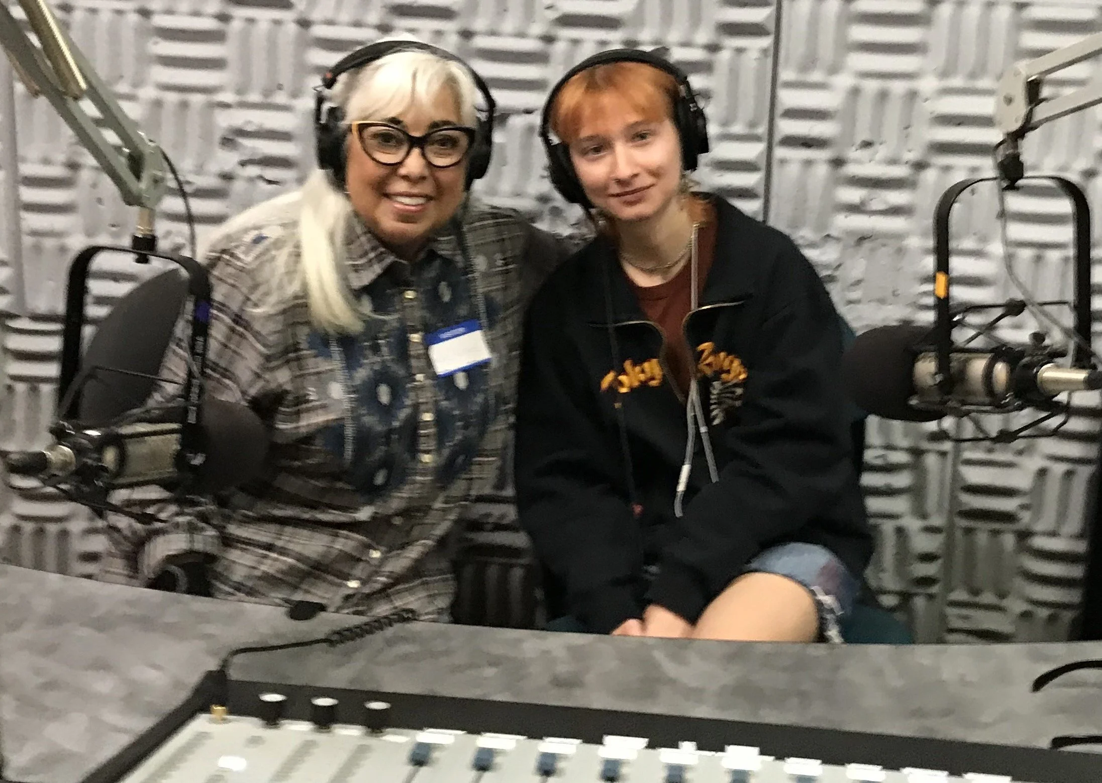 Ava Maurizia, right, wraps up her interview with Rose Aguilar McHone in the KECG studio at the high school. Photo by Jon Bashor