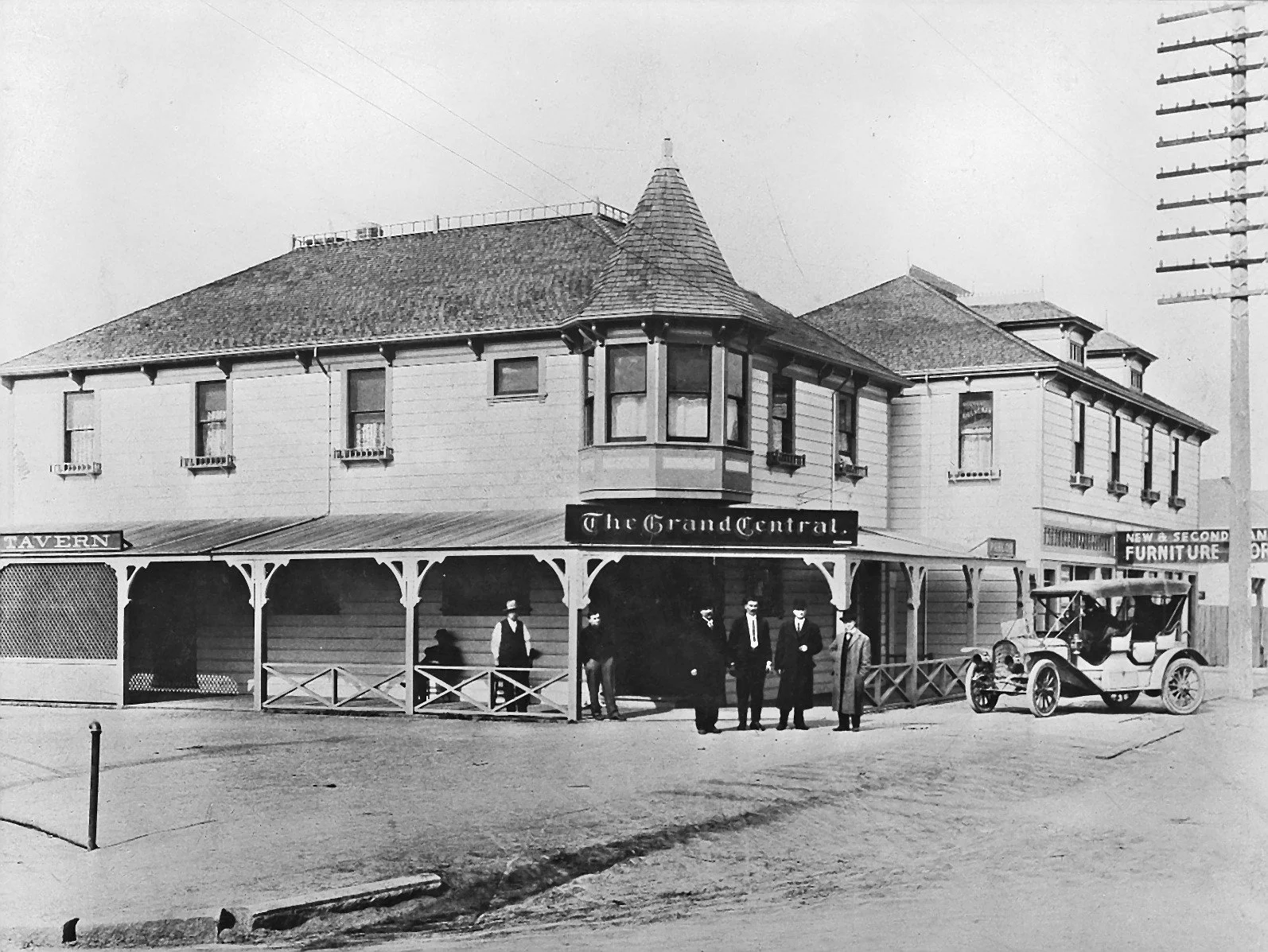 The Grand Central building, at the northwest corner of San Pablo Avenue and Potrero Avenue. The owner of the building, Mr. Lavigne, standing, with the vest and white shirt. Next to him is his son Joe Lavigne, leaning against the post. Dr. Breneman's office was upstairs on the right in this building for a time; his name can be seen on an upstairs window. This building was demolished in September of 1967. EC Hist. Society Collection.