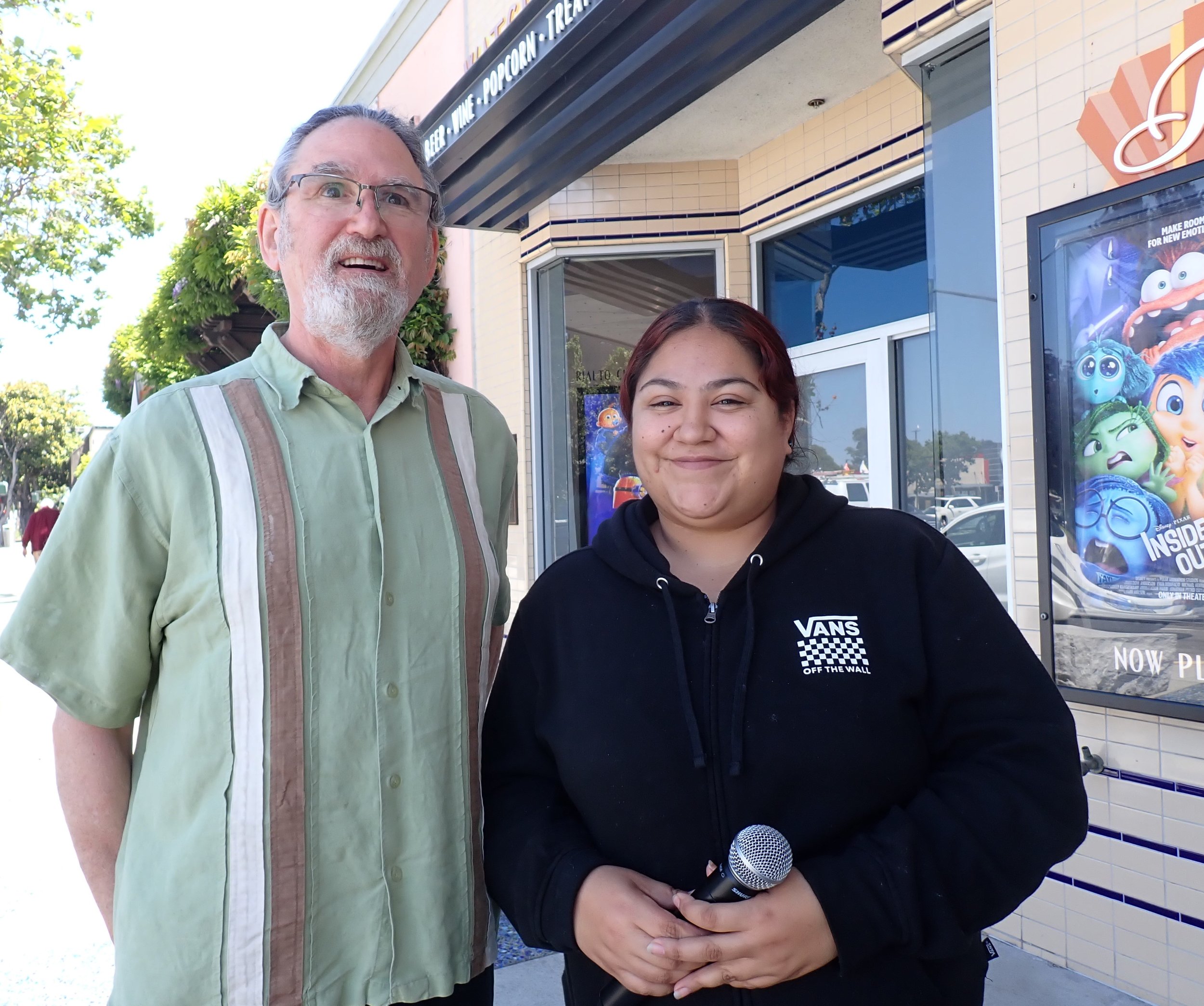 Mike Freeman and Rialto Cinemas Cerrito theater manager Paolo Jimenez at the June 2024 screening of Mike’s film, ‘Our Local Cemetery: Portal to the Past.’ The showing filled the theater. Photo by Dave Weinstein
